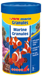 sera marin Granules is the staple food consisting of carefully manufactured granules for all marine fish that eat in the middle water layers and at the bottom. Due to the carefully selected, natural ingredients such as marine algae rich in iodine, Spirulina and Krill, the food is very popular even amongst choosy fish and optimally fulfills their natural requirements. Healthy development, splendid appearance and disease resistance are supported. The slowly sinking soft granules quickly become smooth without losing their shape, and do not pollute the water. |
