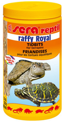 sera Raffy Royal is the delicacy consisting of natural, gently dried fish (50%) and shrimps (50%) for terrapins as well as other bigger carnivorous reptiles, amphibians and big predatory ornamental fish. The rather big food animals must be torn into smaller chunks by the turtle, which represents natural feeding behavior. The food is very rich in optimally digestible protein, omega fatty acids, minerals and trace elements. This attractive snack supports development and liveliness when fed additionally on a regular basis. |