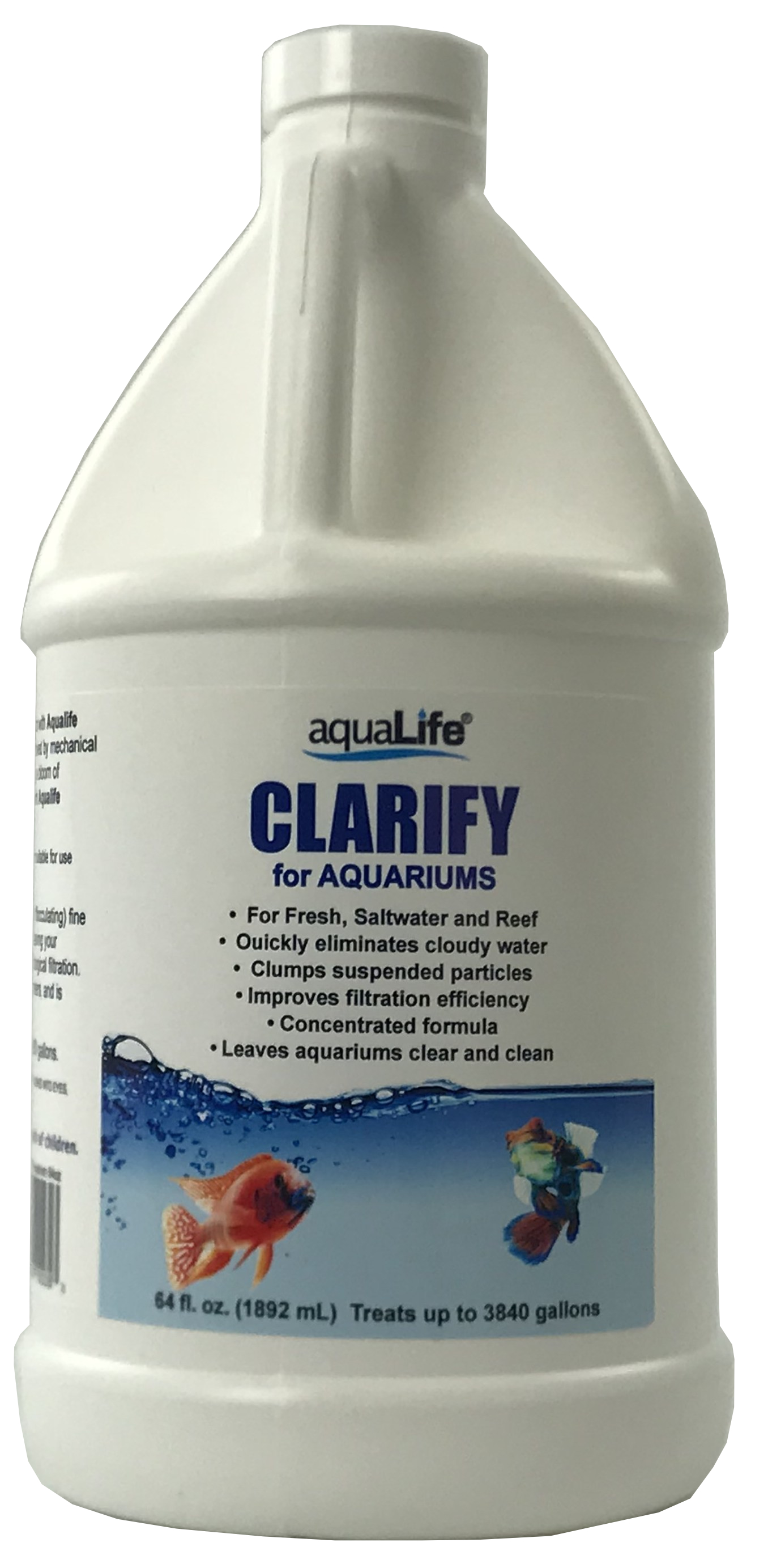 Cloudy water will never be a problem again! Enjoy a crystal clear aquarium with AquaLife CLARIFY for Aquariums. Suspended particles that are too fine to be removed by mechanical filtration cause water to appear cloudy. Whether resulting from overfeeding, a bloom of bacteria, or gravel dust, cloudy water can become clear water in minutes with AquaLife CLARIFY for Aquariums.
