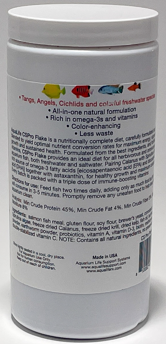 Aquarium Life Support Systems continues to offer the highest quality, scientifically formulated products at price points reflecting true value. Our CS PRO Calanus Spirulina Flake fish food is no exception. Formulated from the best ingredients, and fortified with vitamins and probiotics, CS PRO , this flake food offers a rich source of omega-3 fatty acids [eicosapentaenoic acid (EPA) and docosahexaenoic acid (DHA)] together with astaxanthin, for healthy growth and maximum coloration. Plus, every batch is packed with a triple dose of immune-boosting vitamins.