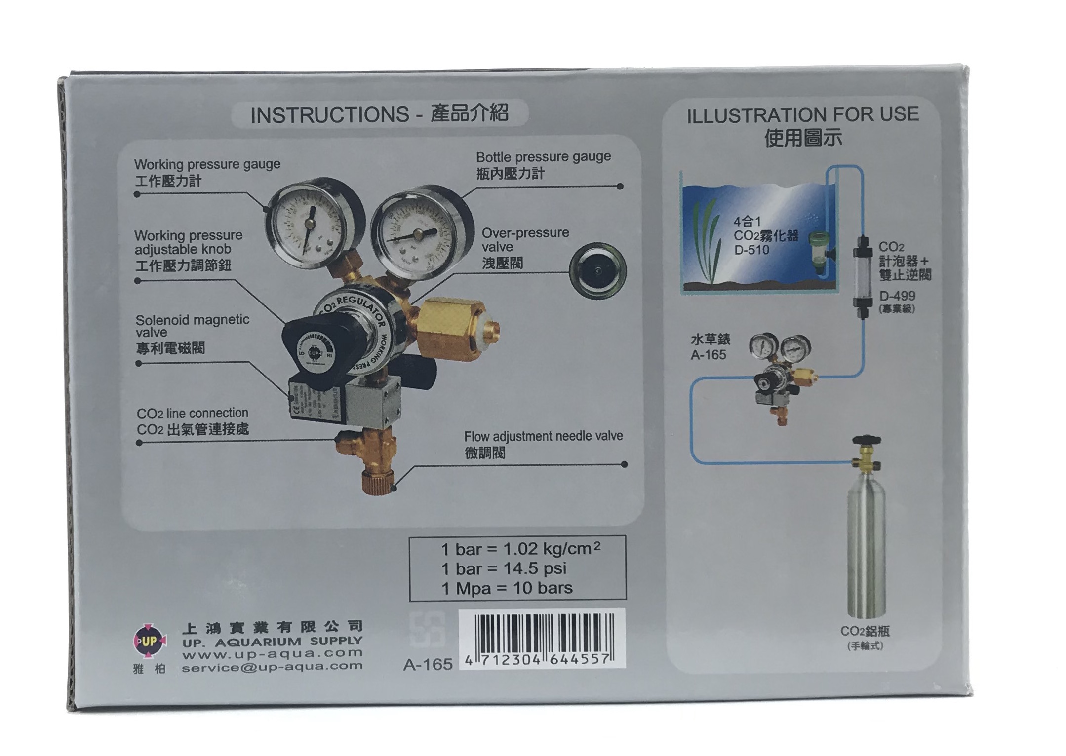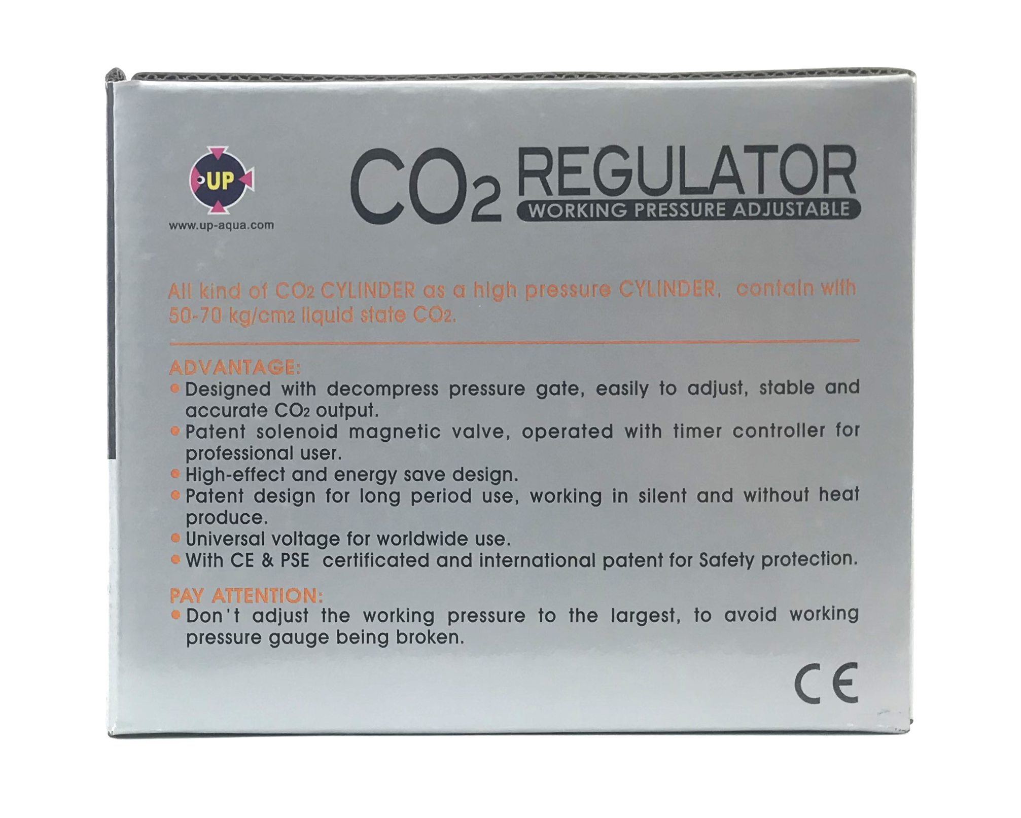Up Aqua's Dual Gauge Regulator (CO2 Regulator with Adjustable Valve & 2 gauges) has an adjustable working outlet pressure. This regulator is made of heavy duty brass construction and equipped with a CGA320 (standard US CO2 thread) connector.