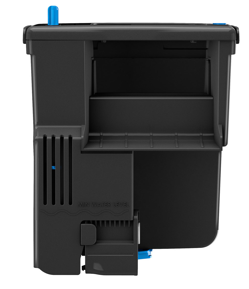 The large capacity design of the filter basket allows for any type of filter media to be interchanged and placed in custom configurations. This filter system is designed for easy and convenient maintenance. The filter media basket is designed to hold the largest volume of filter media versus other brands and prevents any water by-pass around the filter media. The dual water intake feature will capture the water just below the surface, where excreted fish oils accumulate, and deeper in the tank removing floating debris. The pump is self priming. The maintenance monitor reminds you when to clean the filter. In the event of a clog, the water diversion channel allows overflow to go back into the aquarium. The adjustable leveling device allows for precise filter positioning on the tank. The adjustable flow regulation wheel allows you to adjust performance to specific aquarium volume or type. It enables different environments for fish who prefer more or less flow or oxygenation. The feature offers up to 80% reduction of maximum flow intake while making full use of the filter motor. When reduced flows are selected, the refiltration grid allows for water to re circulate through the filter media thus maximizing performance through increased contact time. |