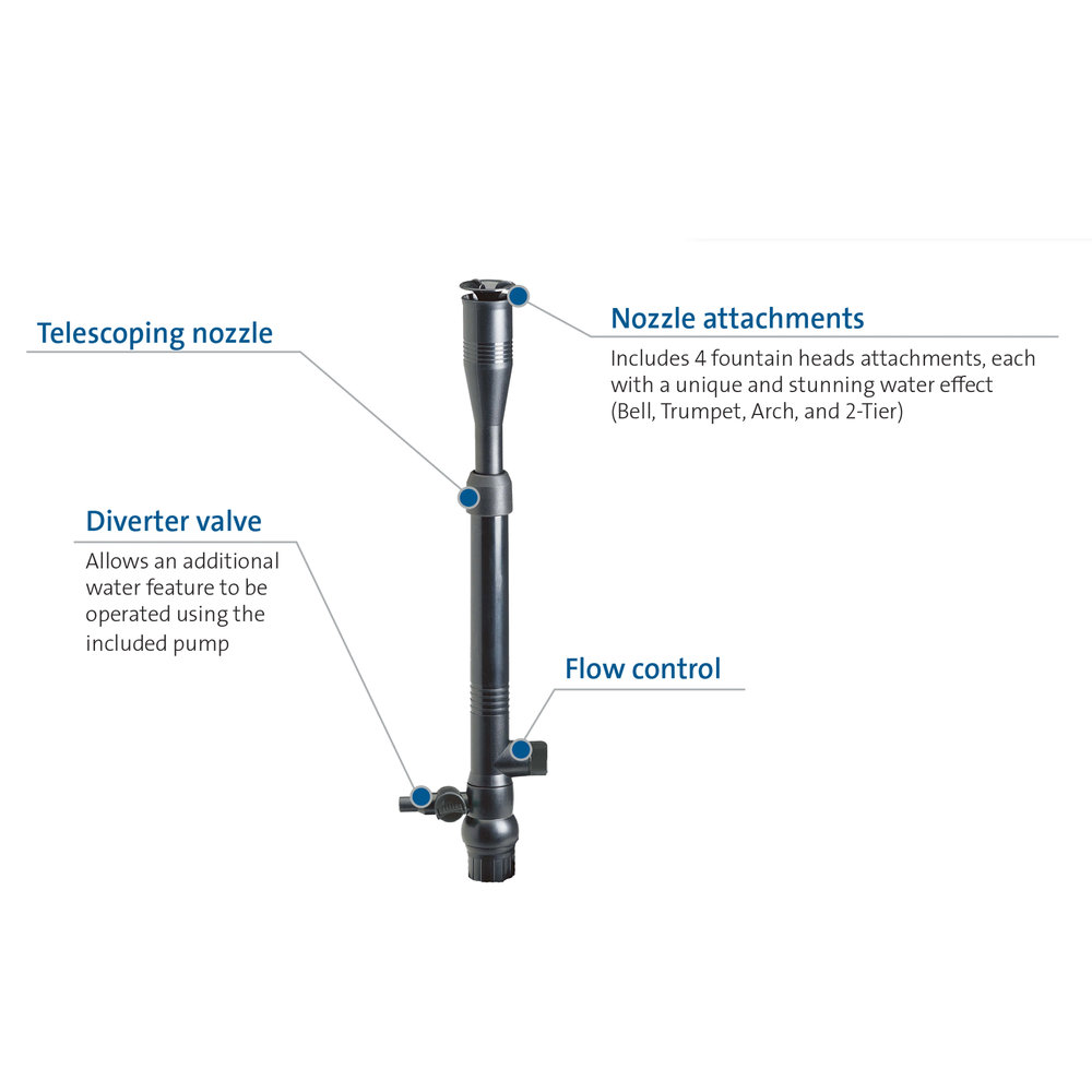 The four-pattern nozzle set is the most diverse nozzle in the collection, offering bell, trumpet, arch and two-tier water designs. All settings offer exquisite cascades of water, creating an engaging focal point for your landscape and waterscape. Constructed of durable plastic material to minimize maintenance, this four-pattern nozzle set connects to the fountain pump through a 1/2 inch (13mm) opening and extends to a height of 5 inches (127mm). The four-pattern nozzle set is designed to work with the Fountain Pump (320 or 525 model), the Aquarius Universal Pump (180-370 models), or the Pond Pump (225, 350, or 575 models). The fountain attachments can be paired with OASE LunAqua Classic 3 light set to create a dual effect that is both entrancing and sublime. Whether your landscape embodies clean lines and calls for a more modern, polished water pattern; or your preference leans toward classic and traditional, the flexibility of the four-pattern nozzle set makes it the optimal solution.