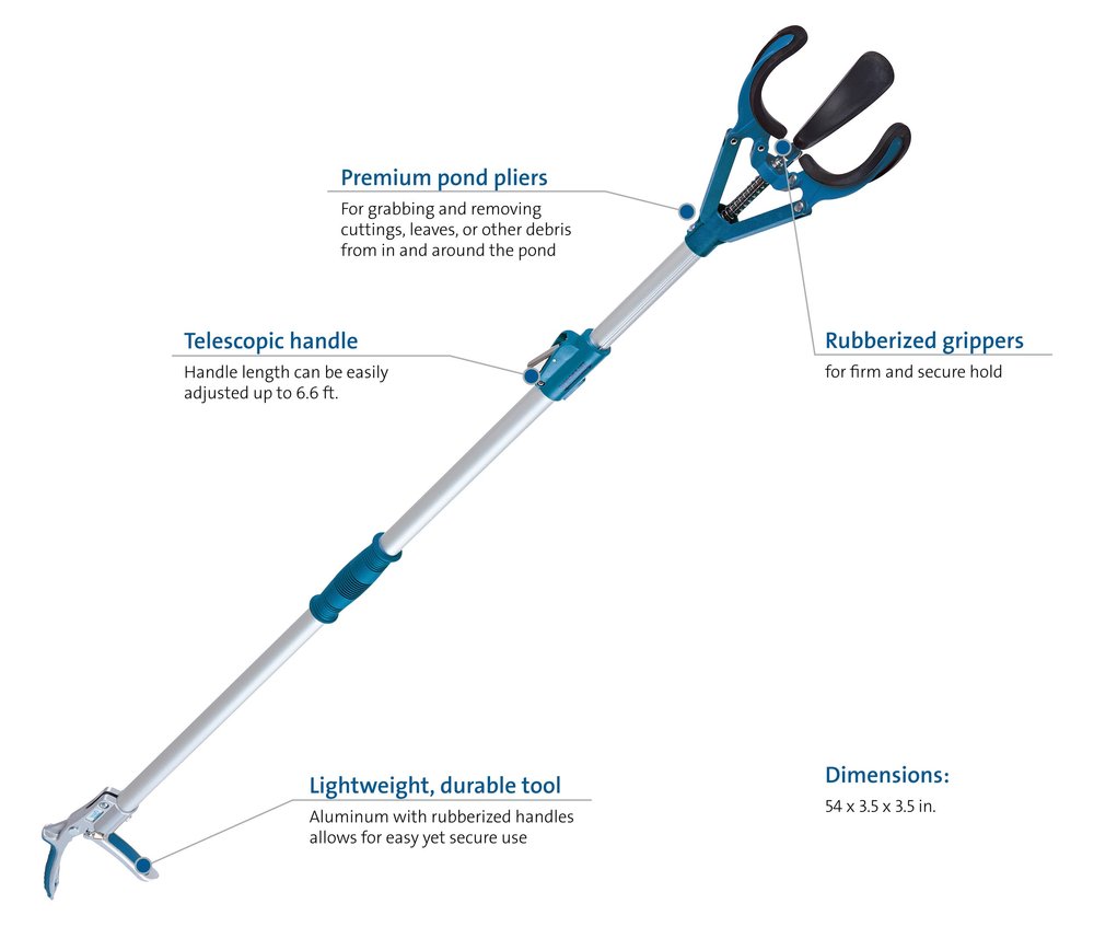 Consistent pond maintenance to ensure its health and beauty creates a visual effect that wows. You've planned impeccably, worked tirelessly, and attended to every intricate detail. Your pond is beautiful, healthy and the envy of all. The fish stock and aquatic vegetation create the perfect juxtaposition with your lush landscape. Perfection is attainable, but keeping up with Mother Nature requires commitment. Leaves, sticks and branches stand between you and total admiration. Organic clutter detracts from its beauty. Keeping your pond debris free - while you stay dry - is in reach with the EasyPick pond pliers. They ensure easy removal of cuttings, leaves or other debris from the pond or its banks. EasyPick pond pliers are 54 in. (4.5 ft) long, but their telescopic handle enables them to be adjusted to 6.6 ft. The rubberized handle allows for a strong grip even when extending for hard-to-reach spots. Keeping your pond free from disintegrating organic debris will contribute to a healthy environment for plants and aquatic life.