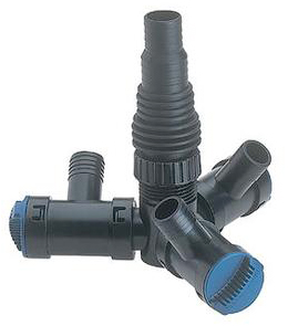 The Multi WD 1” water distributor is equipped with one inlet and three outlets. The inlet is a stepped hose adaptor that can fit several sizes of tubing for versatility (3/4” , 1”, 1-1/4”, 1-1/2” or 19mm, 25mm, 32mm, 38mm). The outlet size is 1” (25mm) allowing for optimum water flow. Each outlet is equipped with a flow control nozzle, so flow can be adjusted to the needs of the pond. The configuration of the Multi WD 1” creates optimal interaction between pump, hose and water outlet. If a double distributor function is required, amend the configuration by placing the sealing cap (included) over one of the outlets, restricting water flow. Creating a beautiful pond that requires minimal maintenance and reconfiguration is predicated on making proper decisions through the design and development phases. |