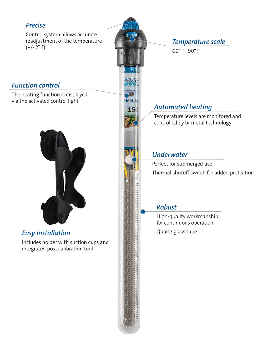 The OASE HeatUp line of aquarium heaters are designed for marine and freshwater tanks. For optimal heating, utilize the HeatUp 200 to create uniform temperature levels for your aquarium environment. The control system on the heater allows accurate readjustment of the temperature (+/- 6°F) and can be adjusted using the included post calibration tool. The temperature scale can be adjusted between 66°F - 90°F. The HeatUp is perfect for submerged use and includes a thermal shutoff switch for added protection. The heating function is displayed via the activated control light. Temperature levels are monitored and controlled by bi-metal technology for automated heating. The quartz glass tube provides additional safety for aquarium use. Integrate this heater into the BioPlus 200, FiltoSmart 200, BioMaster 350 to combine filtration and heating into one location for more undisrupted beauty in your aquarium. Utilize the ThermoFit FiltoSmart 200 (model number 48532) to secure the heater to the FiltoSmart 200 filter. The included holder with suction cups can be used to install the heater to the side of the aquarium. This heater is protected with an included 3 year warranty.