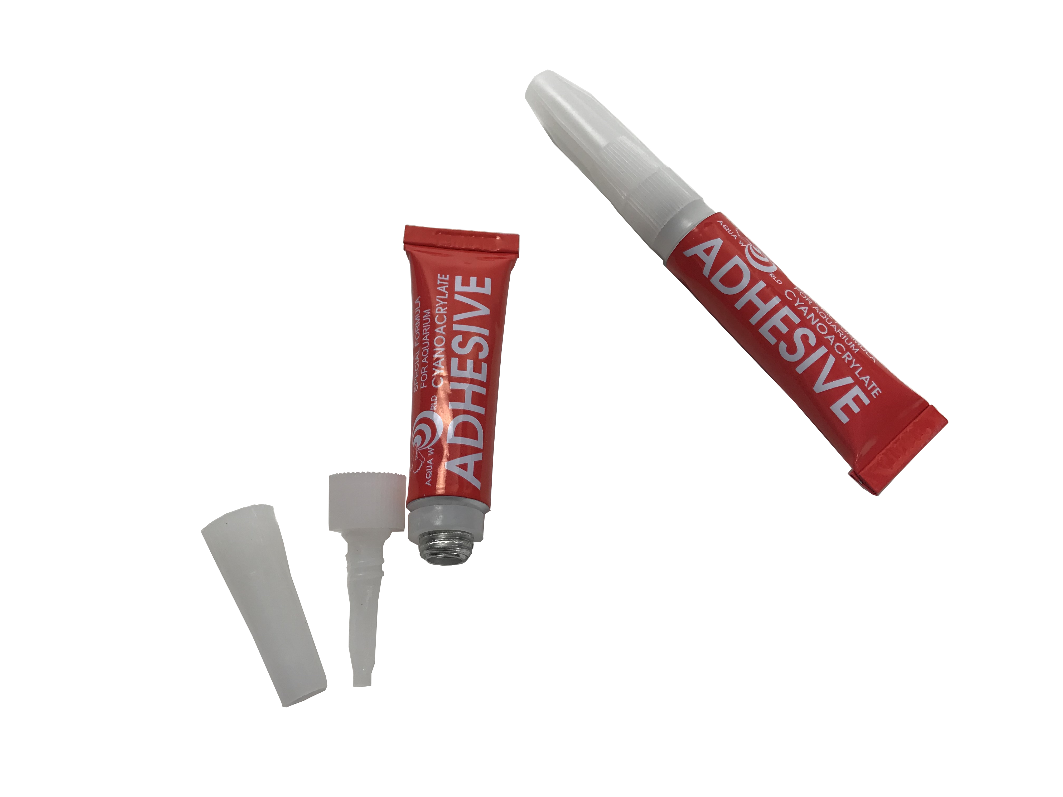 Up Aqua’s Adhesive may be applied to most plastics, rubber, ceramic, coral, hardwood, leather, and moss. After applying adhesive, hold for 10 seconds to allow adhesion. Refrigerate after opening.