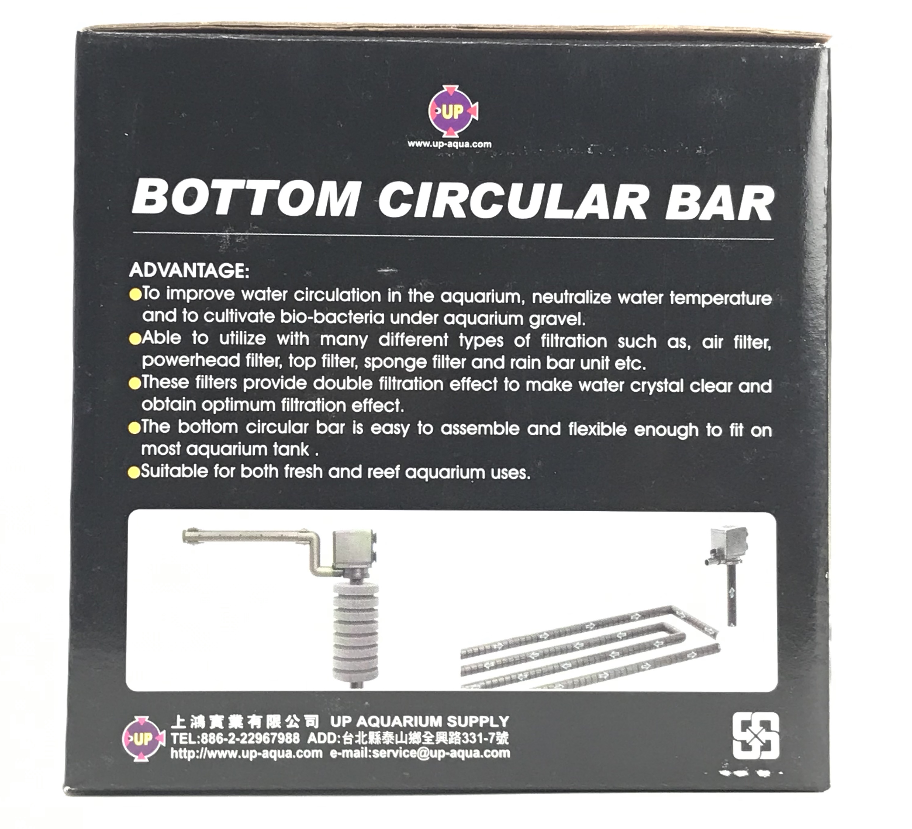 Up Aqua’s Bottom Circular Bar is used to create reverse flow filtration, biological reactors, or planted beds. This bar improves the circulation of oxygen in the bottom layer of the aquarium and helps to maintain a good environment. It can be used with many different types of filtration such as an air filter, powerhead filter, top filter, sponge filter, and rain bar units. These filters provide double filtration to make water crystal clear and to obtain optimum filtration. The bottom circular bar is easy to assemble and flexible enough to fit on most aquarium tanks. It is suitable for both freshwater and saltwater aquariums. In a saltwater aquarium, the water current is regulated which lessens the oxide of the nutritious salt.