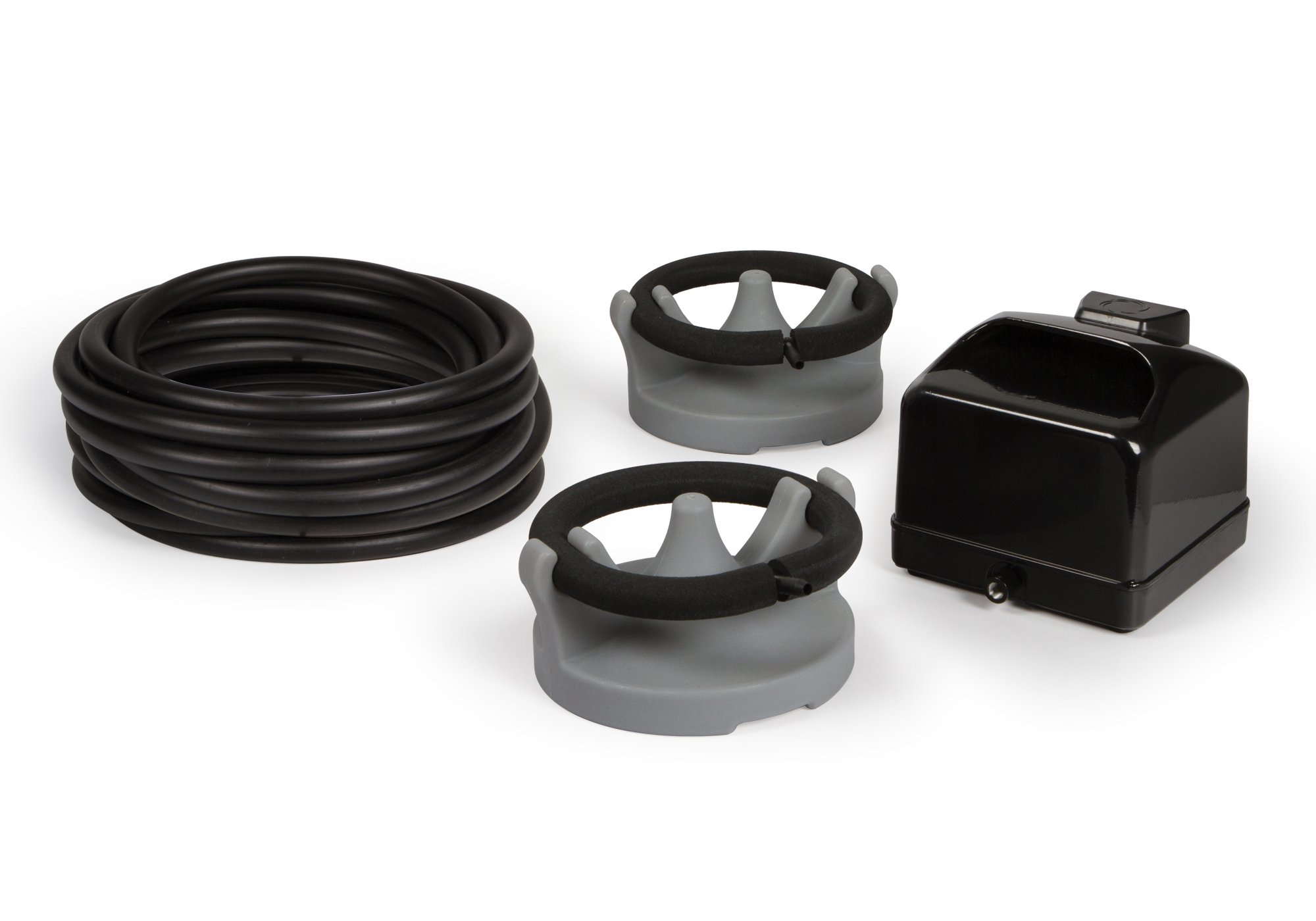 • High output for large water gardensand koi ponds with greater oxygen demand • Replaceable diaphragms extend pump service life • Circular diffuser design maximizes upwelling and water circulation • High efficiency non-clogging diffuser tubing reducesfriction for increased airflow • Kits include air put with 6 foot cord, diffuser, fittings, check valve, and weighted tubing