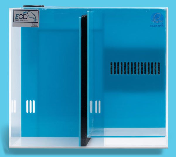 Celebrate Creativity with ESHOPPS, AQUA-FUGE which features a NEW Creative & Innovative design. Featuring ESHOPPS unique Dual Water Channel Design (ECD). AQUA-FUGE utilizes two separate water flow channels. One for the Refugium and the other to the Protein Skimmer compartment. This unique design enables the water to travel through each compartment separately after entering the sump. The advantage of having two separate water channels is the dissolved organic waste can be removed via protein skimming. Further, having a separate Refugium compartment provides an area for supplemental biological filtration. Placing, (BIO-LUX or Macro Algaeās) within the Refugium compartment will facilitate the removal of un-wanted nutrients; such as, (Nitrates and Phosphates). AQUA-FUGE is an excellent choice for the Hobbyist Level aquarist.