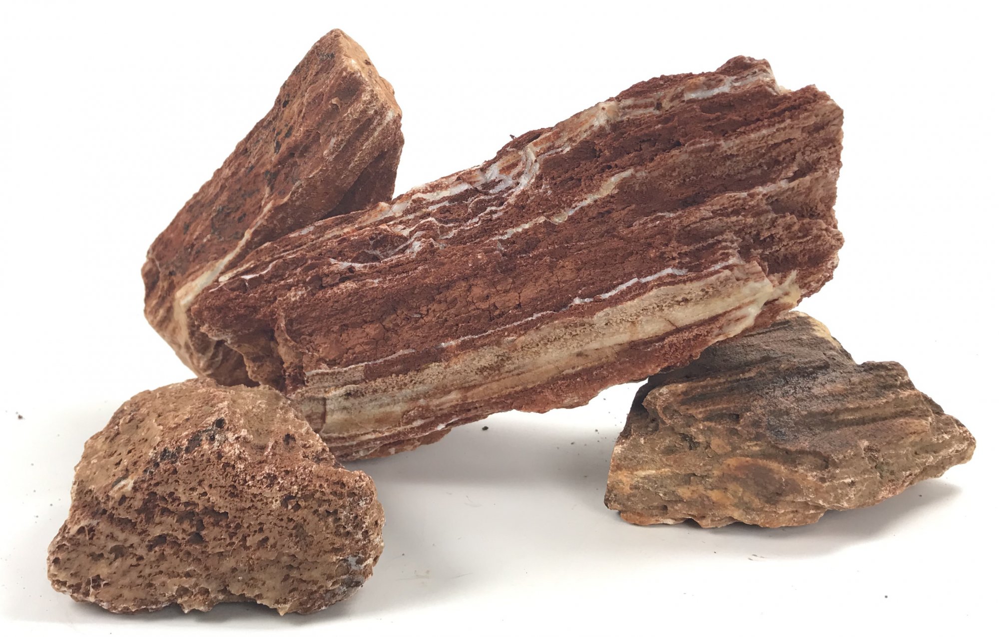 - Rusty brown or reddish stone with streaks of white quartz details