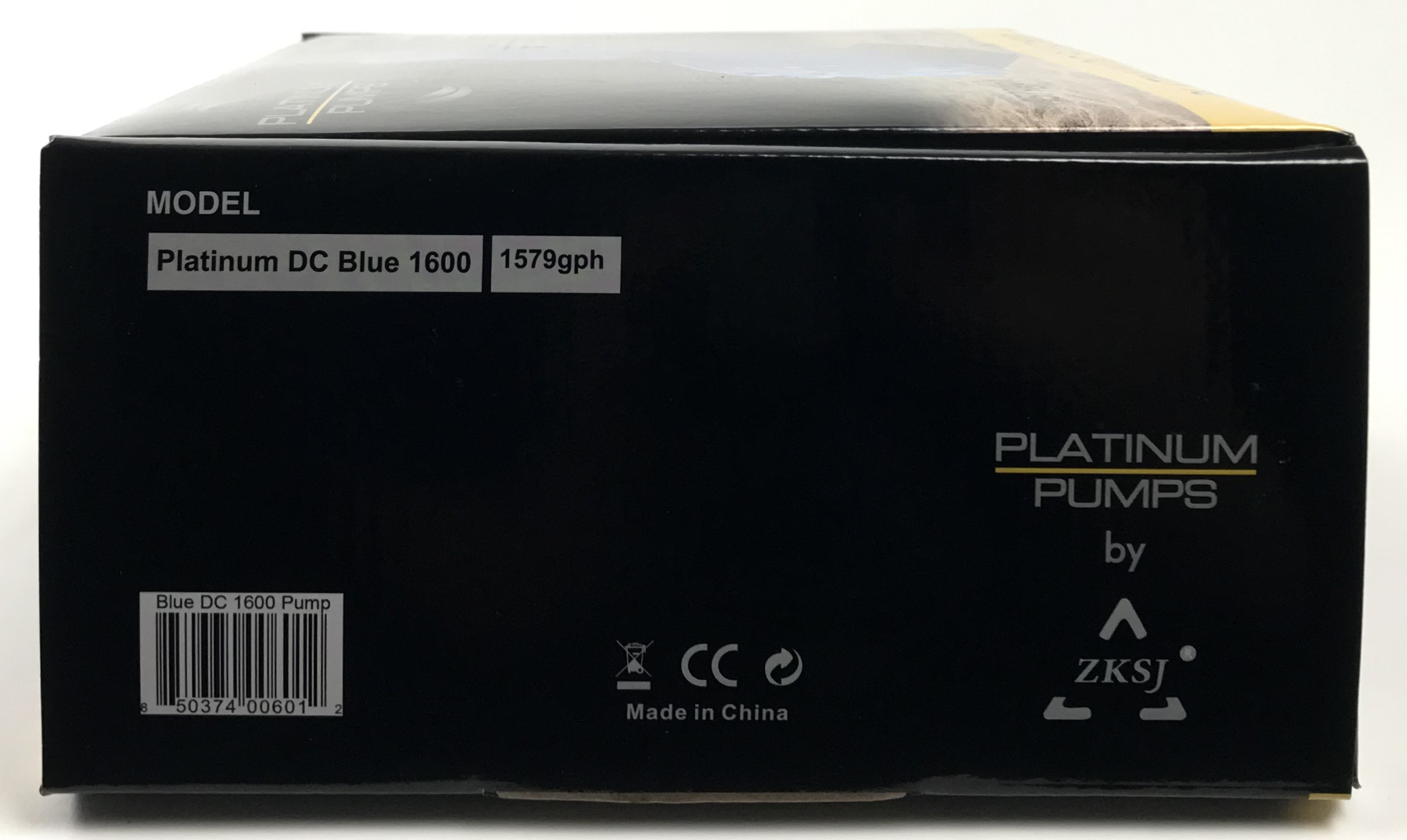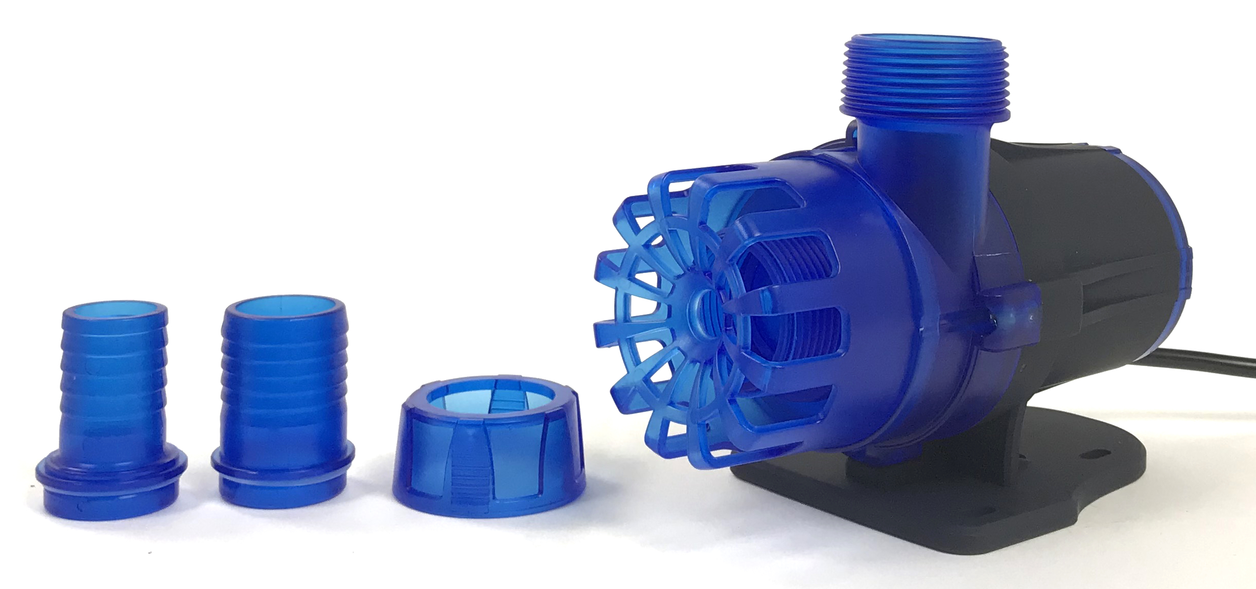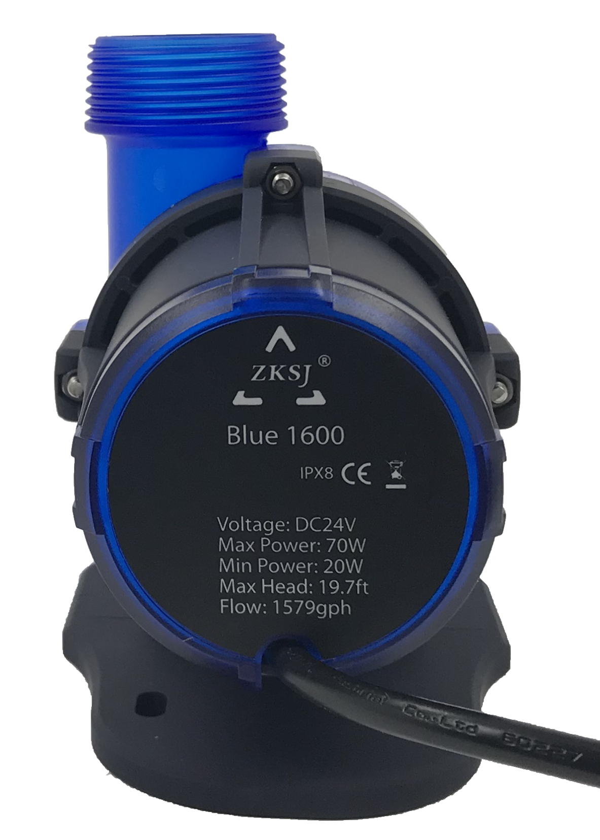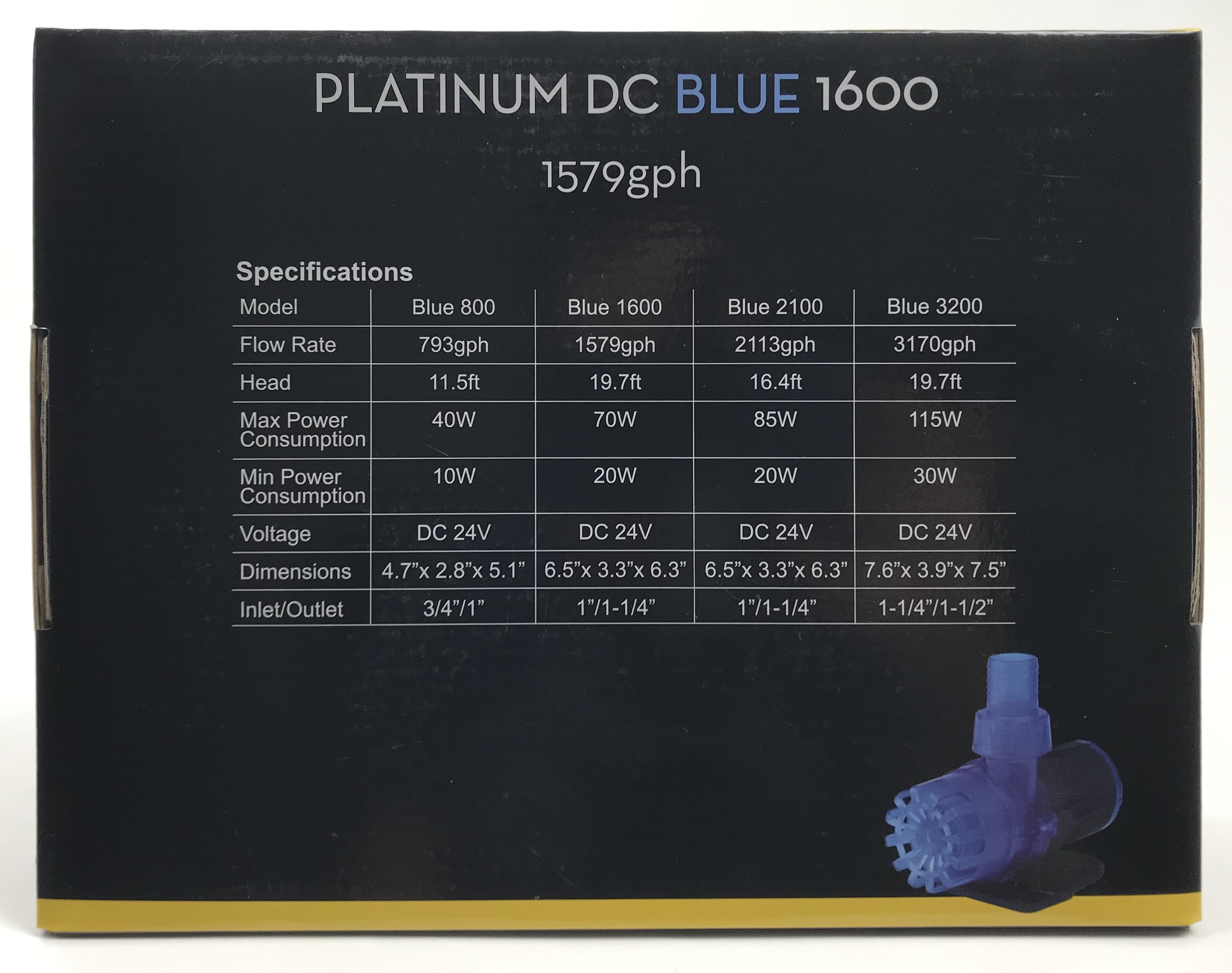 Flow rate: 1579 gph Head pressure: 19.7 ft Min Power Consumption: 20W Max Power Consumption: 70W Voltage: DC 24V Dimensions: 6.5” x 3.3” x 6.3” Inlet: 1 1/4” thread Outlet: 1 1/4” thread; 1” tubing fittings provided