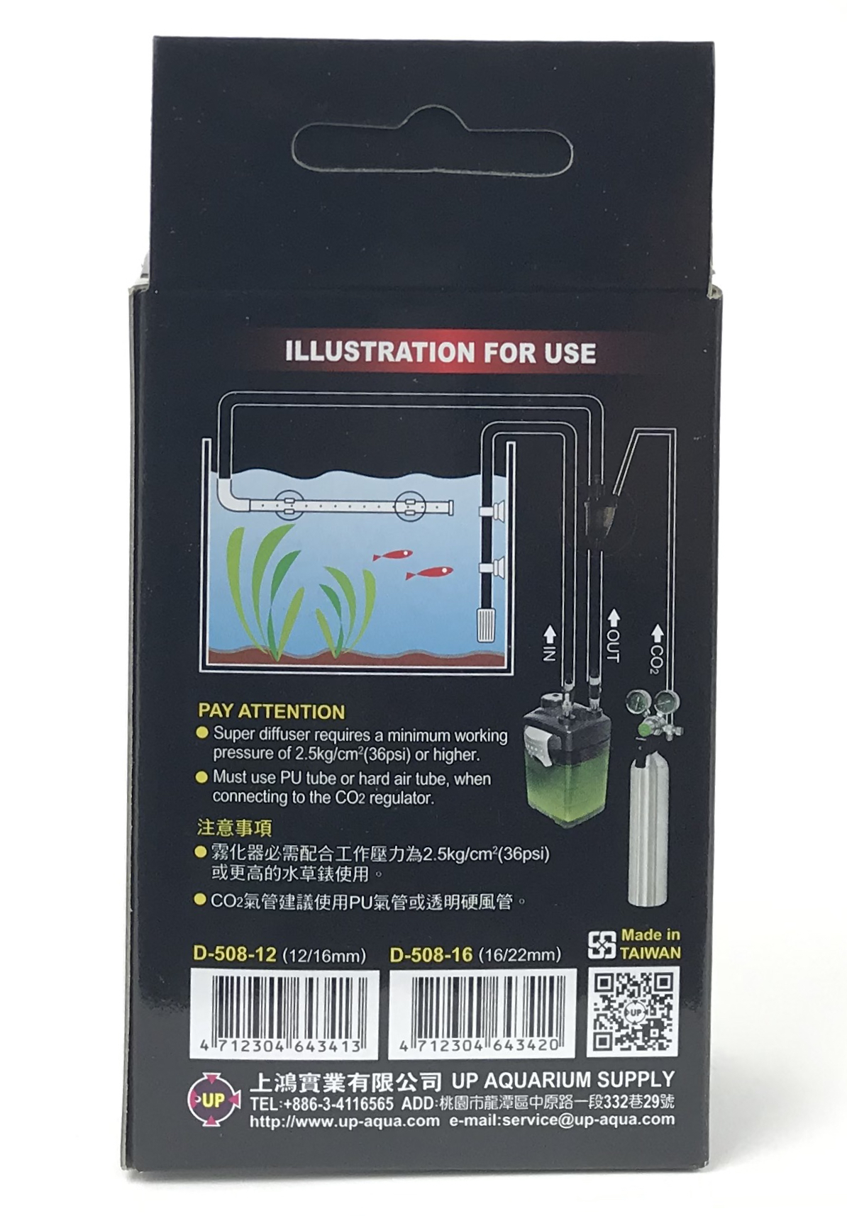 Up Aqua's CO2 inline atomizer is made of ABS plastic, which can handle higher pressures than standard glass diffusers. The atomizer hooks up in line to the canister filter where CO2 is diffused through the fine ceramic atomizer tube, then atomized CO2 travels through the filter's outtake tube.