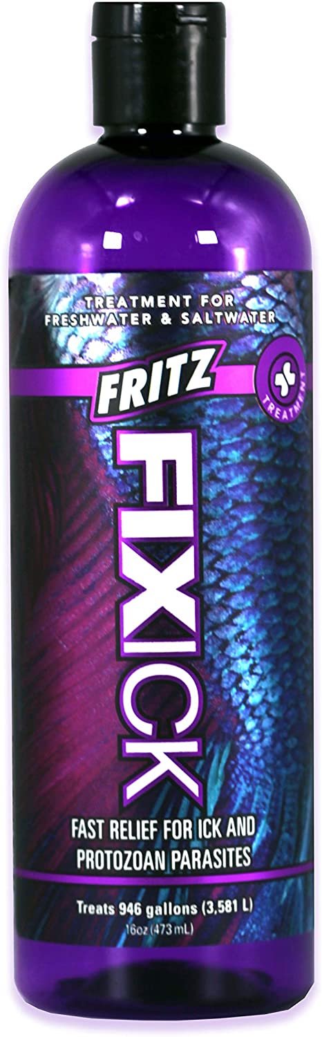 Fritz FixIck is a revolutionary new way to treat aquatic external parasites including Ick, Chilodonella, Trichodina and Tetrahymena. As one of the most common diseases most aquarists will encounter, finding an Ick treatment that is simple, safe, and highly effective can be difficult. Fritz FixIck does not contain formaldehyde, a common active in many ick treatments. Formaldehyde will cause damage to gills and internal organs, which can result in additional stress and fish loss. One of the active ingredients in Fritz FixIck is Gentian Violet, which gives it a recognizable purple hue. This compound is much gentler than malachite green based treatments. Also improving on previous treatments, Fritz FixIck has been shown to be effective at killing Ick parasites with a simple 2-dose system, with no reinfection after one week. Due to Fritz FixIck’s additional antibacterial and anti-fungal properties, secondary infections were also prevented with no additional medications, resulting in even higher recovery rates.