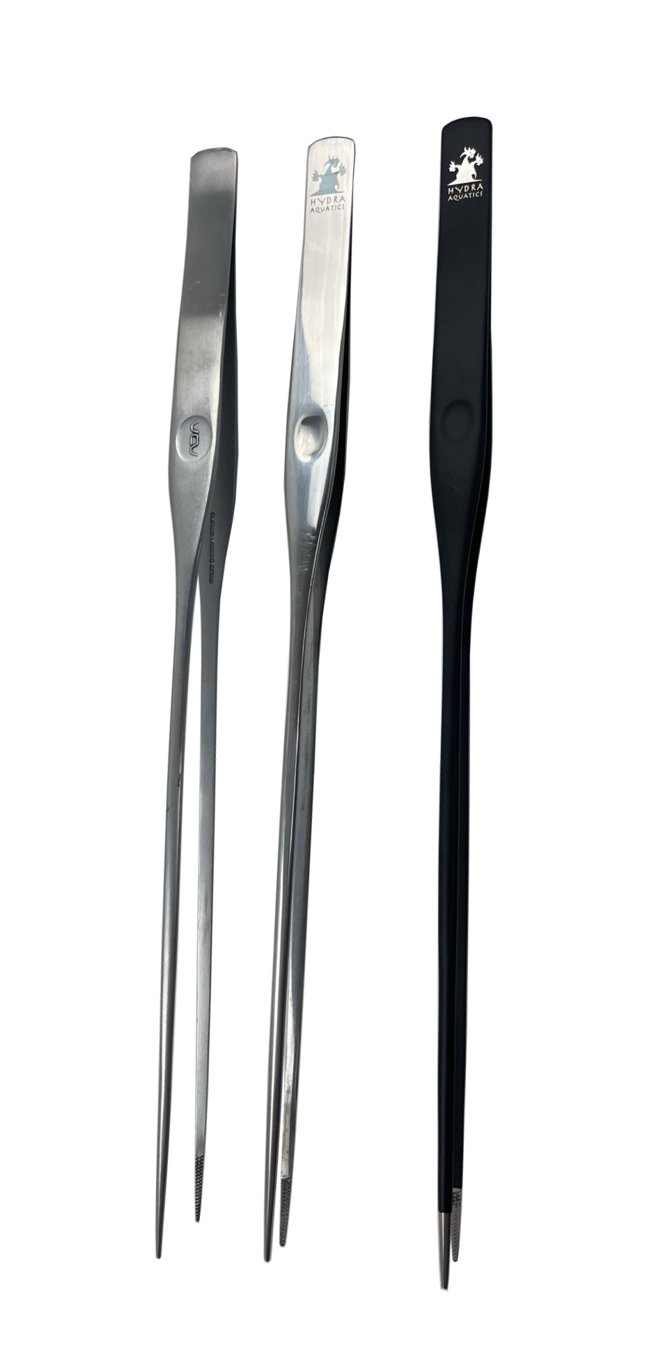 Pinsettes are tweezers for professional aquascaping, designed for superior strength, accuracy, and ease of use. The fine tips allow for precision grip of even the smallest plants. A low pressure squeeze easily allows precise placement without damage to plants. These 12” pinsettes allow enough strength to plant larger plants with ease. Each one is hand-crafted out of German surgical steel and inspected and certified for quality.