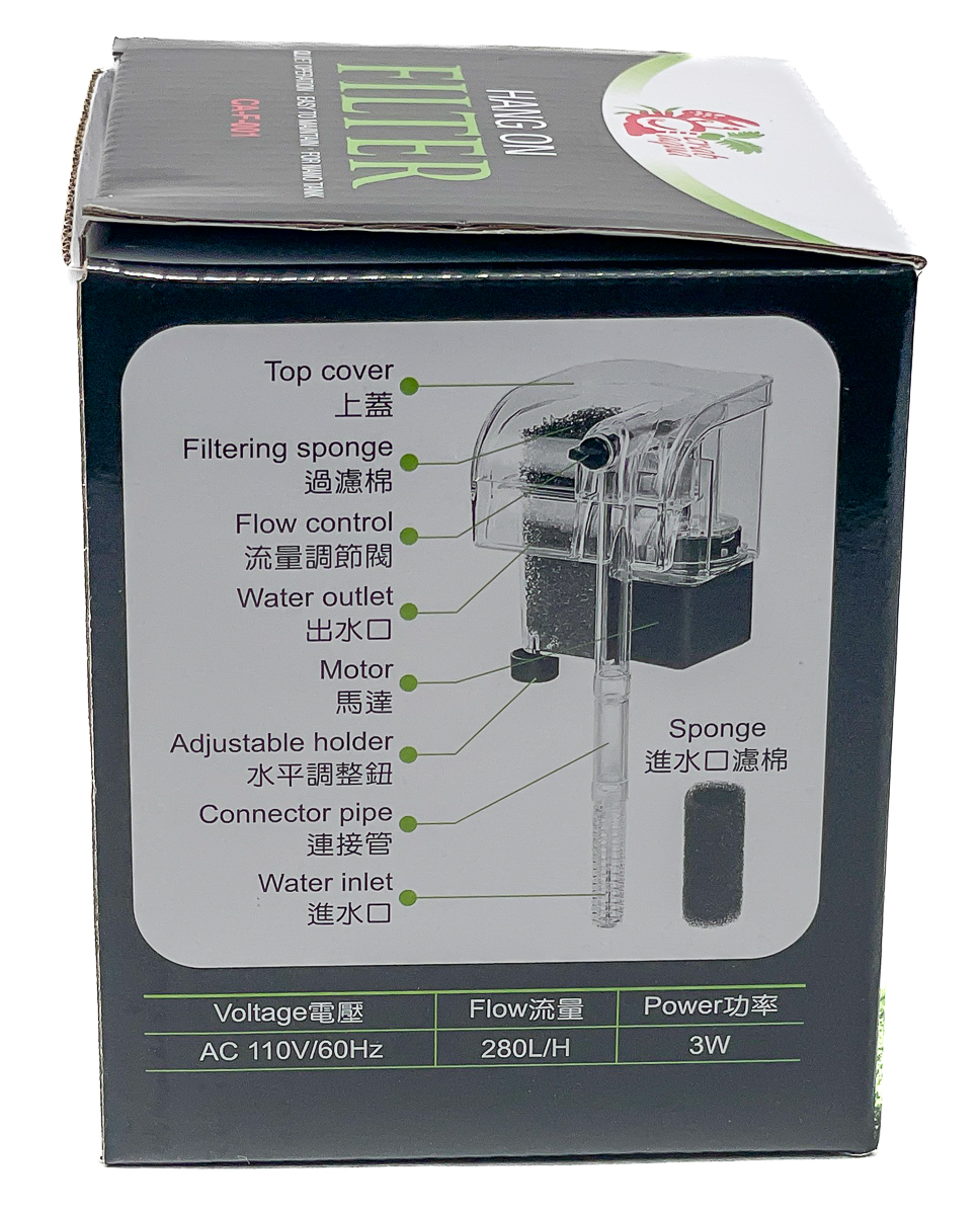 • Equipped with a silent motor for quiet operation • Easy to maintain • Hang-on design for easy attachment • Space saving • Adjustable flow rate • Free add water after power cut • 280 liters per hour adjustable flow 74gph • Water Inlet with sponge • Rinsable sponge filter media