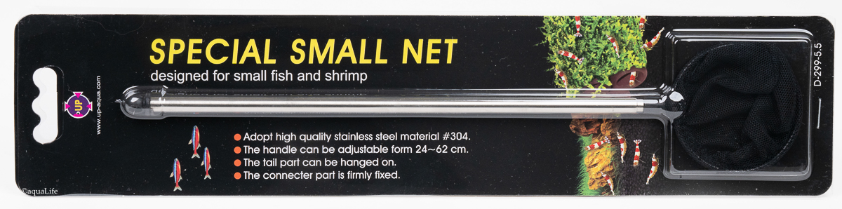 Up Aqua's round fish net works well in small or medium sized aquariums. This fish net has a stainless steel telescoping handle (up to 24"). Equipped with a ring to hook on the Up Aqua Plastic Maintenance Holder. |