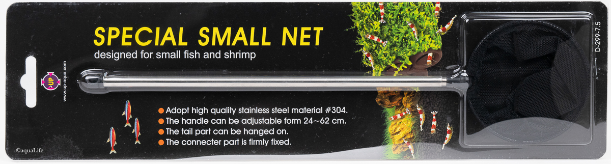 Up Aqua's round fish net works well in small or medium sized aquariums. This fish net has a stainless steel telescoping handle (up to 24"). Equipped with a ring to hook on the Up Aqua Plastic Maintenance Holder. |