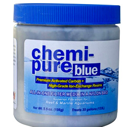 Chemi-pure Blue, for use in reef and marine aquariums, features a new proprietary blend of premium, low dust, pelletized carbon and high capacity ion exchange resins to create a superior all-in-one filter media packaged in a ready-to-use nylon bag. Chemi-pure Blue significantly reduces nitrogenous organic compounds and phosphates while raising redox. It also helps stabilize pH, while creating the crystal clear aquarium water associated with Chemi-pure products for more than 50 years.