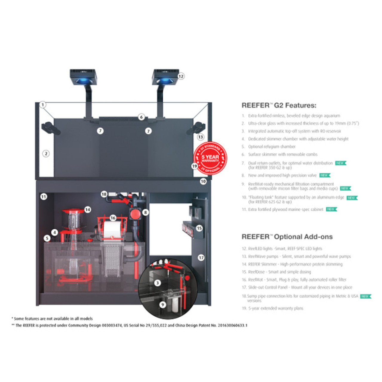 REEFER Peninsula G3 features: • Dual return outlets and hydrodynamically superior piping for optimal water distribution. • Cabinet doors that can be installed either on the left or right side, for optimal sump access. • ReefMat-ready sump with a removable media compartment and a universal connector on the downpipe, for Plug & Play ReefMat installation. • Ultra-clear, beveled-edge glass with increased thickness of up to 0.75”, with silicone protection strips on the bottom & side joins. • New high-precision valve and enlarged inlet section for easy flow regulation and quieter operation. • Extra connectors for both metric and USA standard piping. • Extra-fortified marine-spec plywood cabinets (removable exterior for the S-700 and S-950). • The 3-in-1 ReefATO+ included (reliable and smart ATO + temperature monitor + leak detector). • Standard FREE 3-year warranty . • 5-year extended warranty at great prices for extra peace of mind. Reefer G3 Filtration (Most models*) The new REEFER™ G3 series have advanced sumps with the following exciting new features: •An adjustable height skimmer chamber, enabling you to set the water level for optimal skim performance. • Plug & play ready for ReefMat 500 or 1200 Auto Filter Roller (sold separately) • Micron filter bags and filter media cups • The 3-in-1 ReefATO+ included (reliable and smart ATO + temperature monitor + leak detector). • Additional chamber for chillers, controllers, or other equipment (on most models) • Assembly-ready piping now with extra bulkhead connectors in both Metric and USA sizes for customized setups